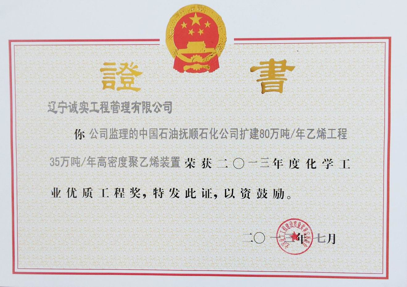 2013年化學(xué)工業(yè)優(yōu)質(zhì)工程獎(jiǎng)(撫順石...