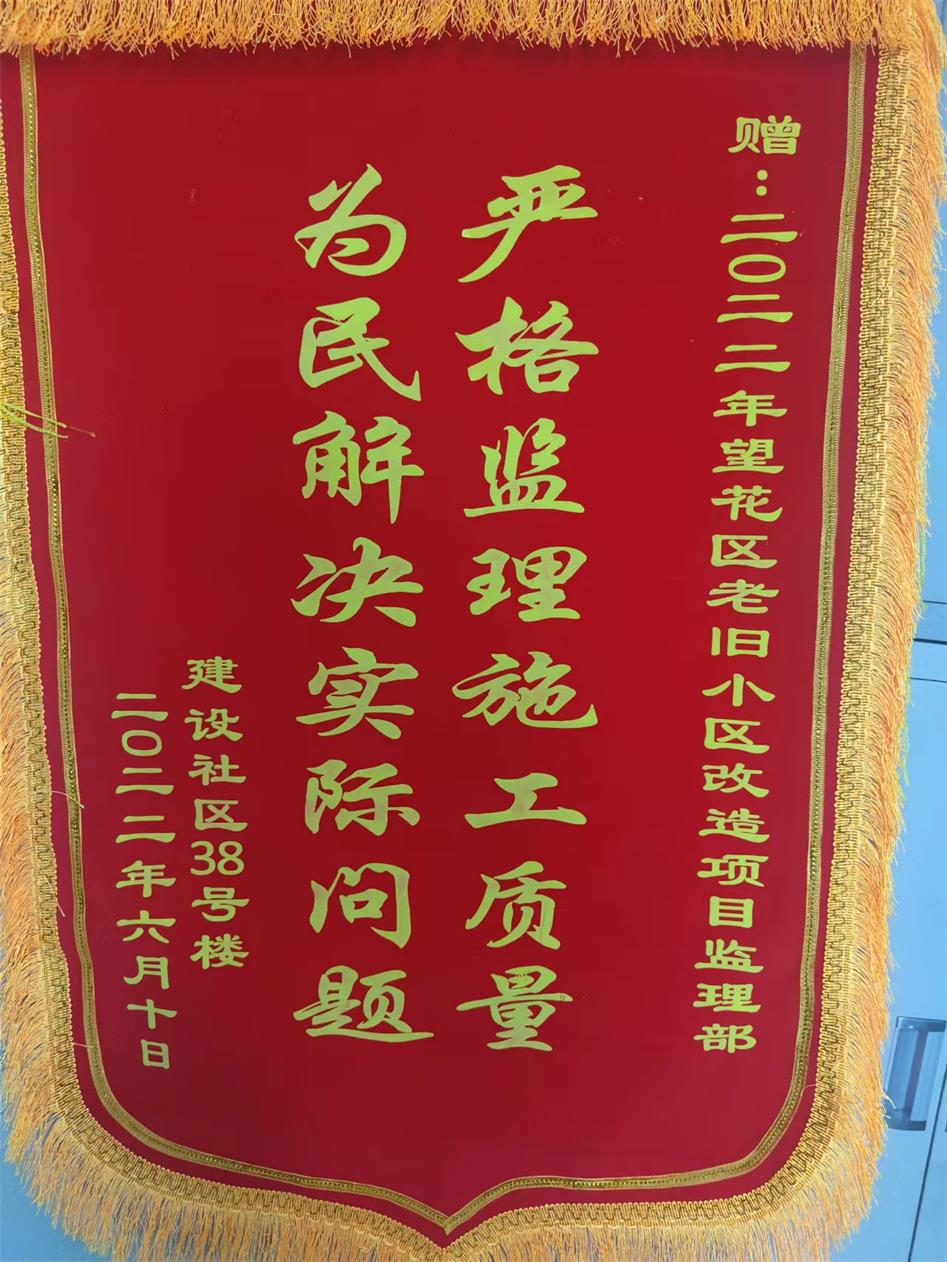 千濤萬漉雖辛苦,吹盡狂沙始到金。一面錦旗既是一份肯定。我們將秉承“誠實、責任、專業、超越”的監理精神,接受政府和市民的共同監督,一如既往、不忘初心、盡職盡責,為推動老舊小區改造,優化小區環境治理,建設文明城市做出應有的貢獻!